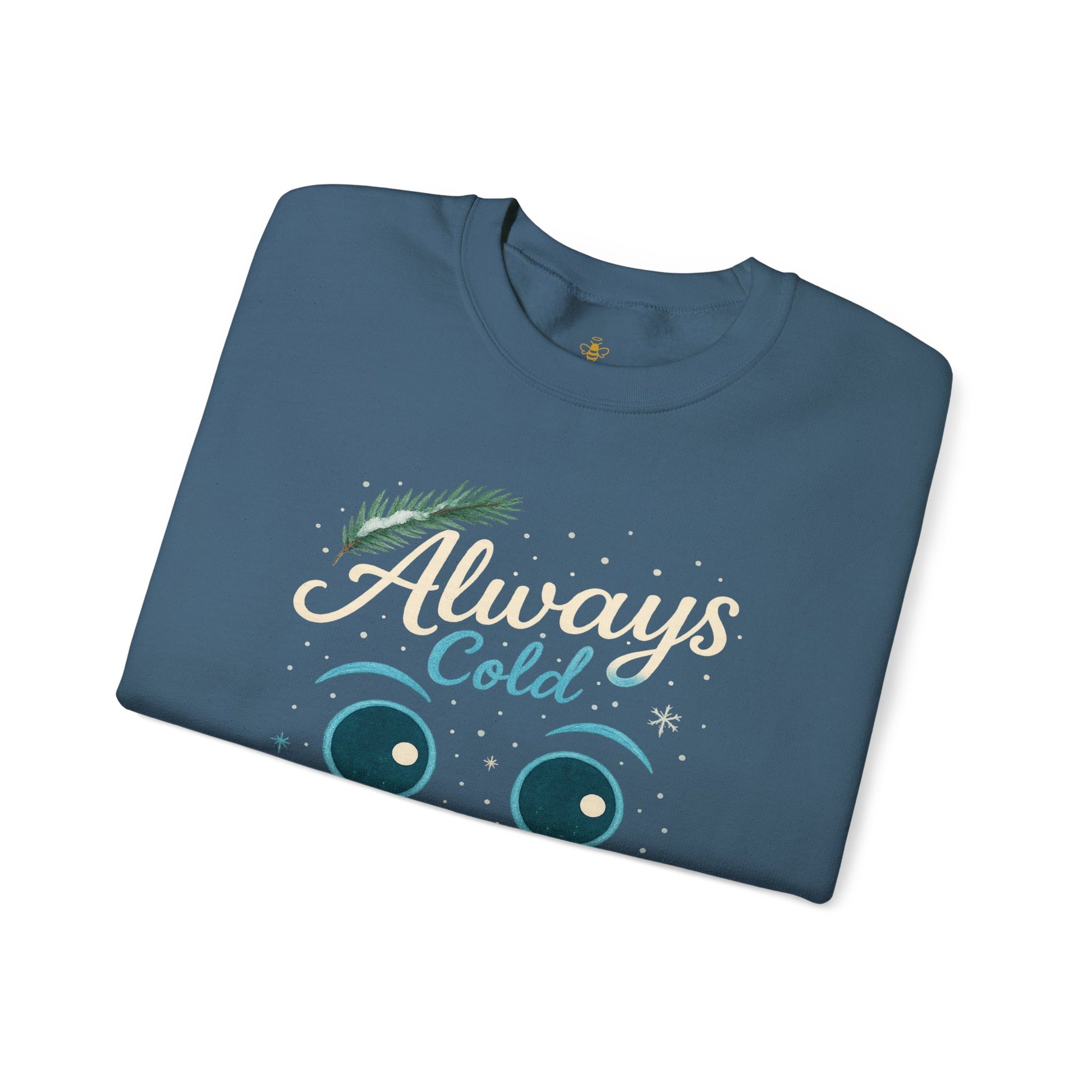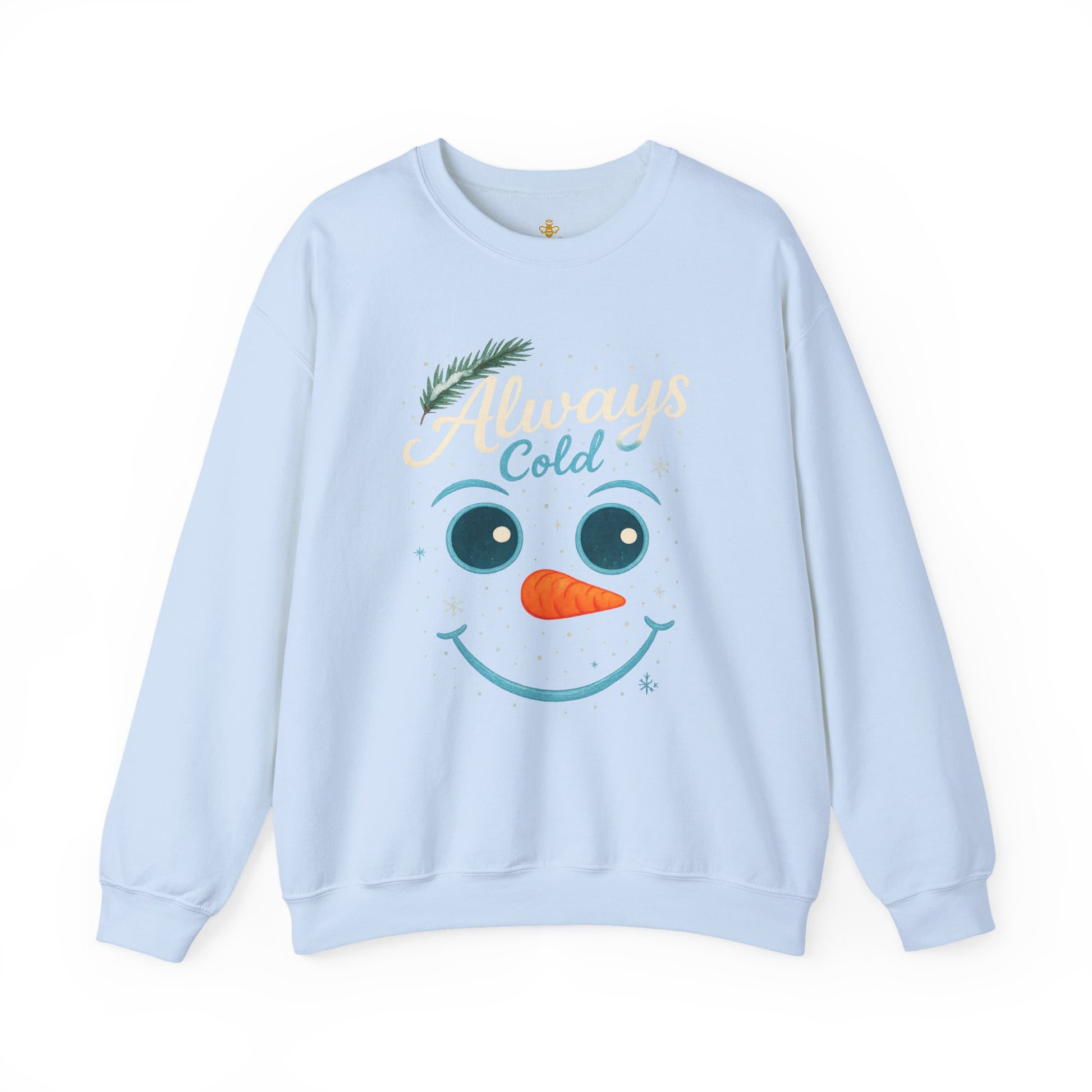 Stay warm and make ‘em smile with this adorable “Always Cold” snowman face design! Featuring playful script lettering, expressive cartoon eyes, and a bright orange carrot nose, this winter-ready sweatshirt is perfect for anyone who’s always reaching for another layer. Cozy, cute, and full of personality—it’s a fun holiday favorite for chilly souls and festive hearts.