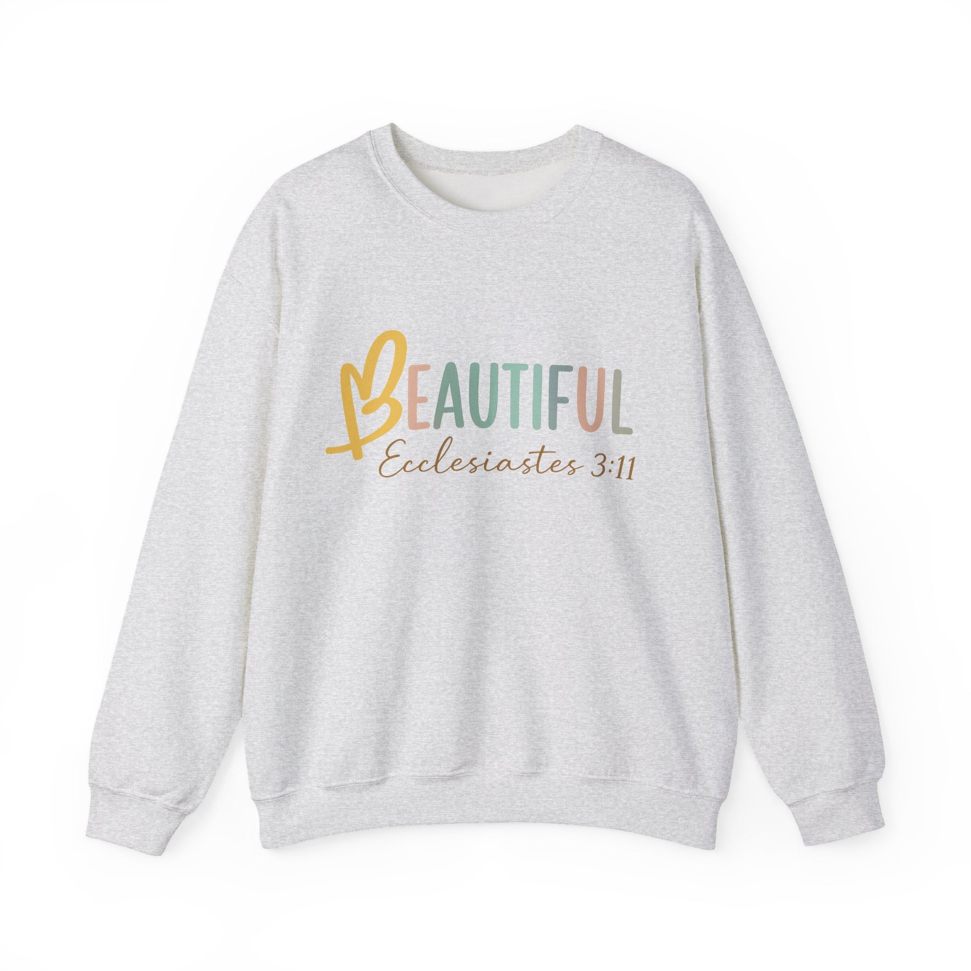 Wrap yourself in a gentle reminder that beauty blooms in God’s perfect timing. This cozy and inspiring sweater features the uplifting message “Beautiful” in soft, pastel rainbow hues with the scripture Ecclesiastes 3:11 woven delicately across the center. Whether you're heading to church, journaling your prayers, or simply embracing a peaceful moment, this faith-based piece reminds you that you are fearfully and wonderfully made — in His time.