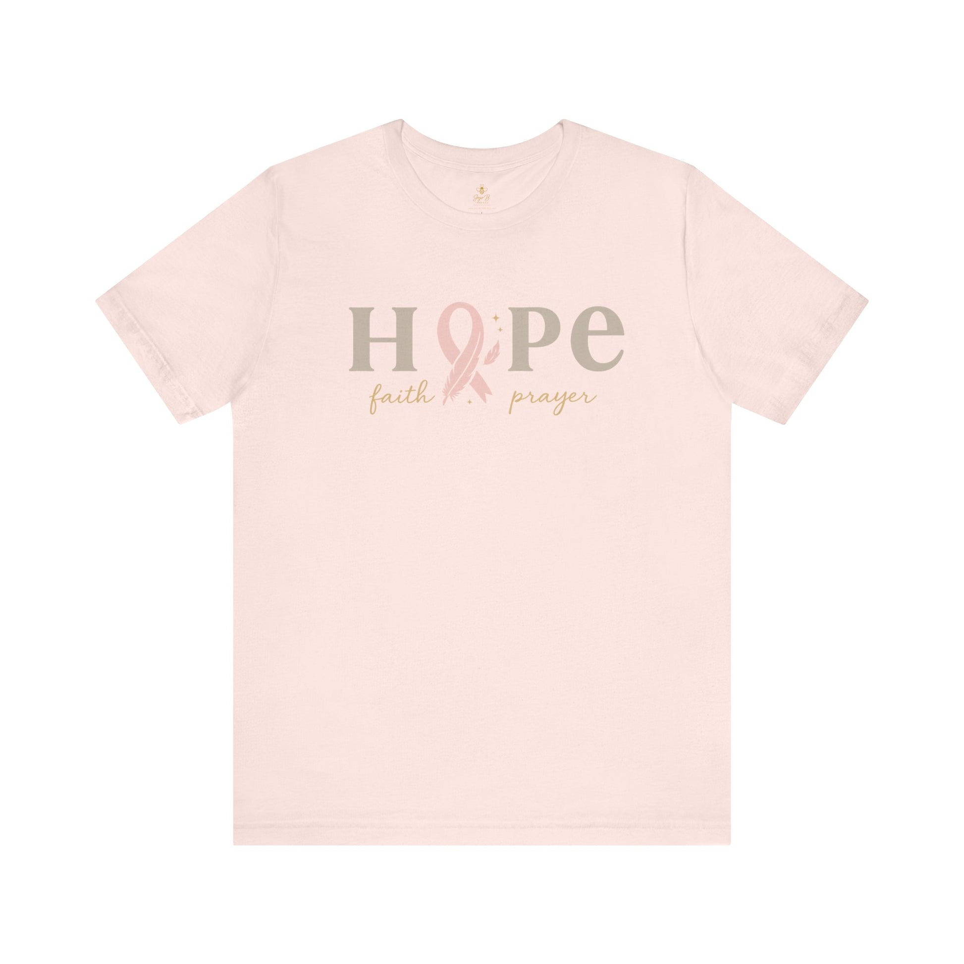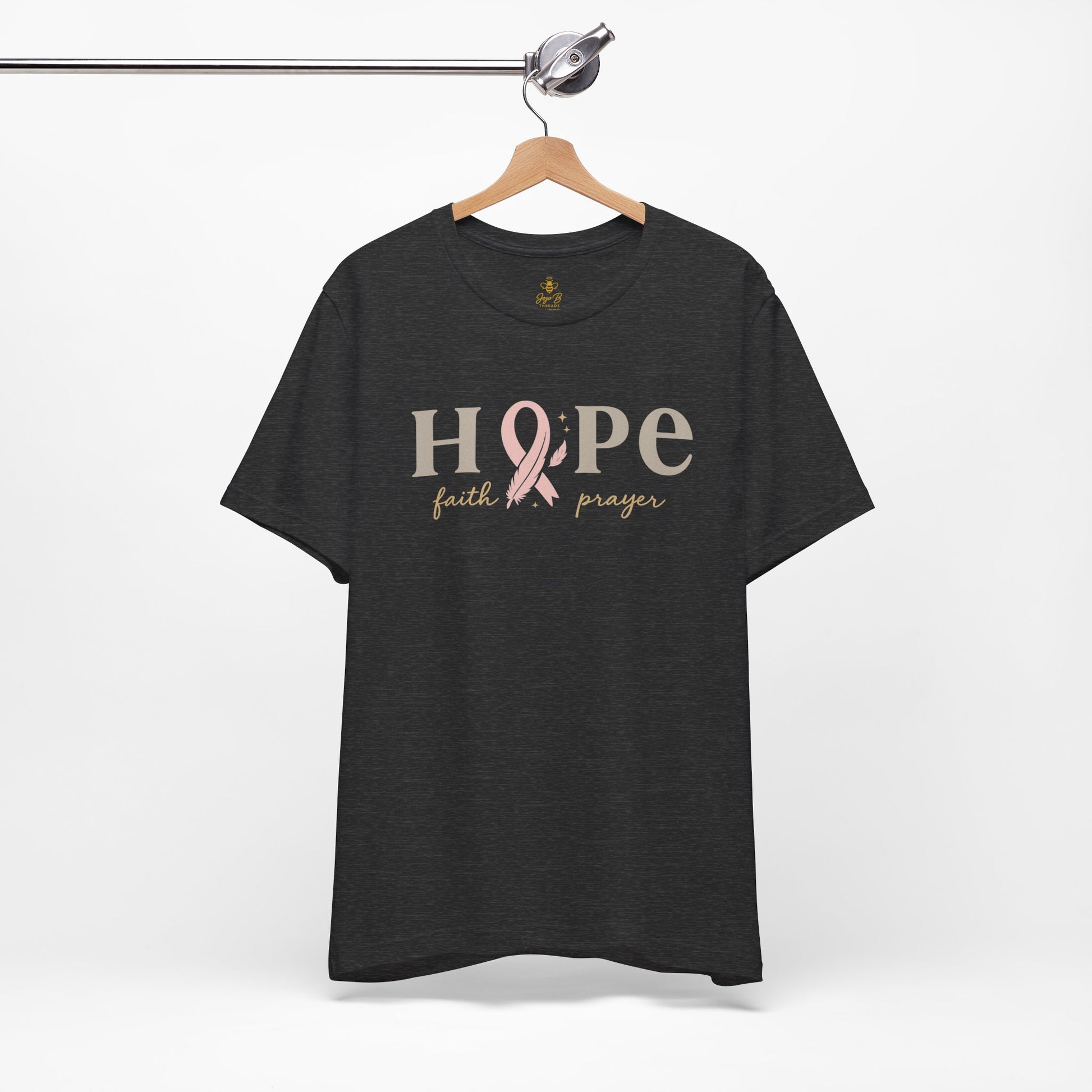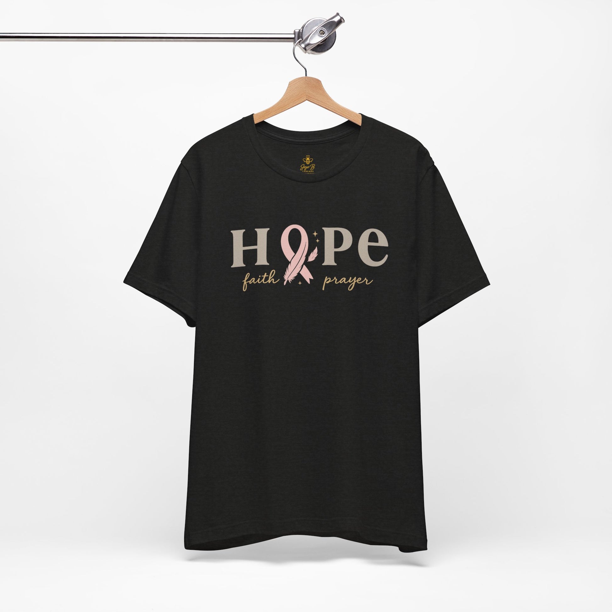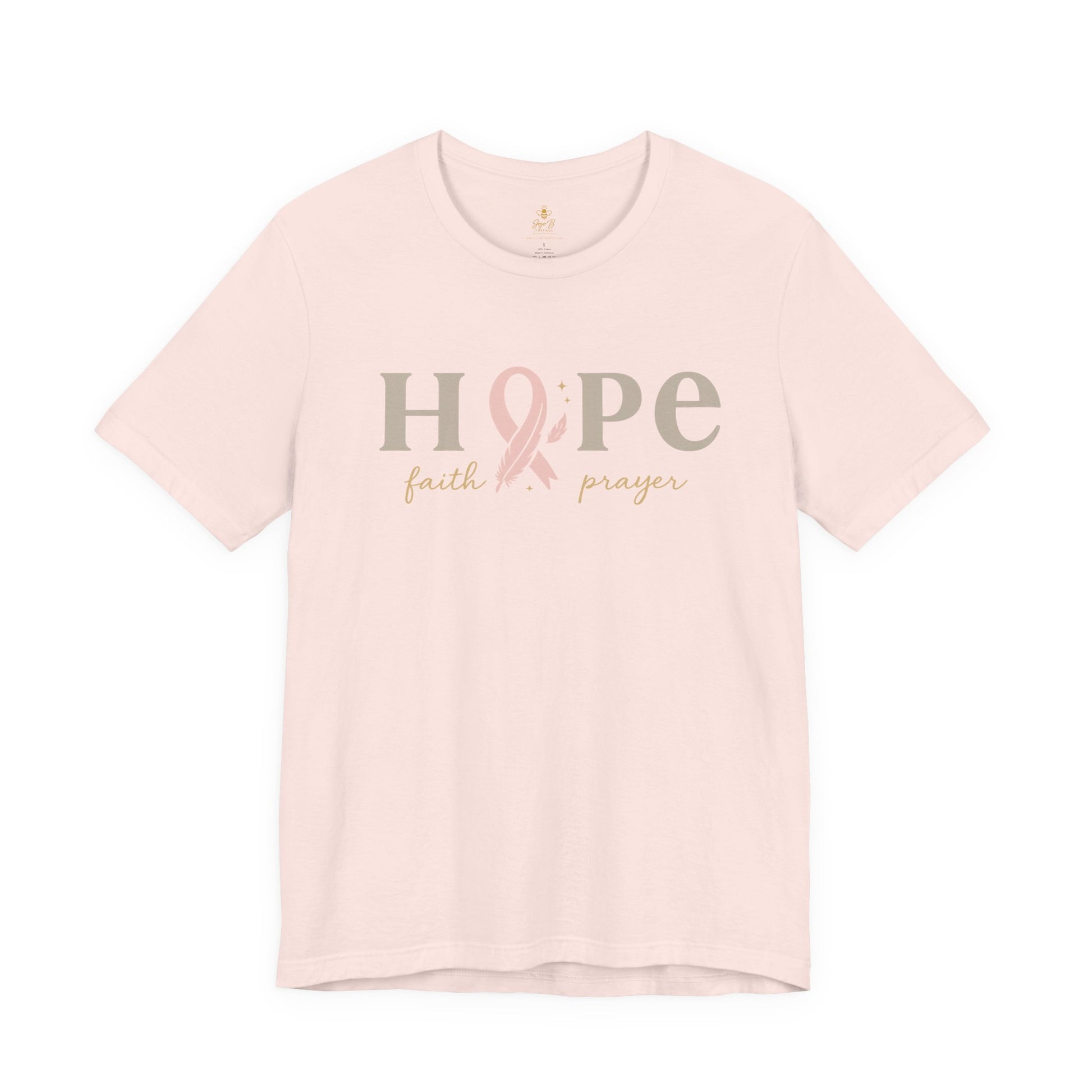 Let your faith rise above fear with this beautifully inspired HOPE tee. Featuring a soft pink ribbon wrapped in a delicate feather and butterflies, this shirt is more than fashion—it's a statement of strength, healing, and unshakable belief. Whether you're supporting a loved one or walking your own journey, wear this as a reminder that hope, faith, and prayer are powerful tools.
