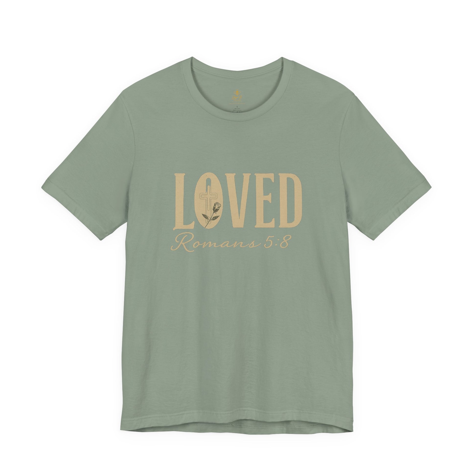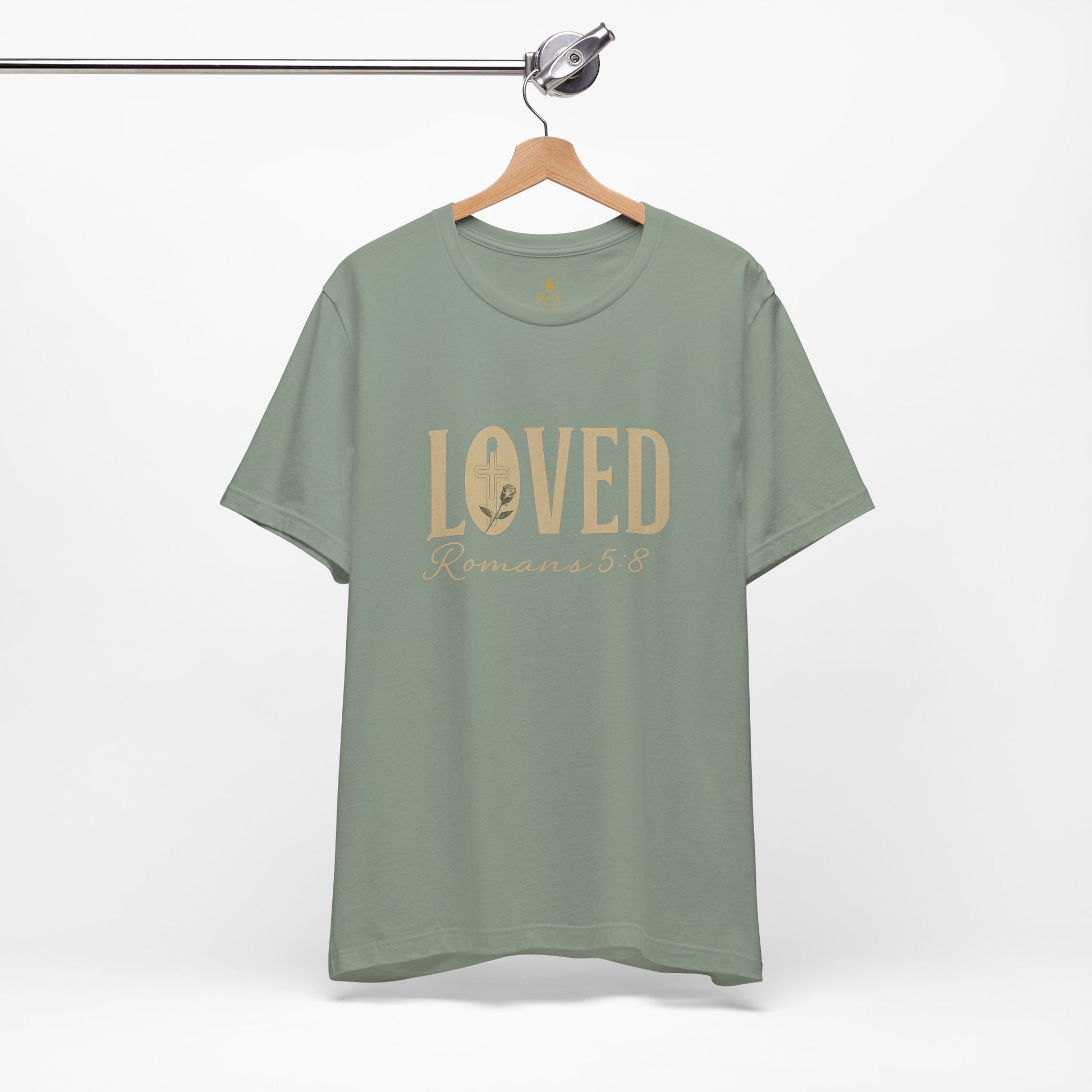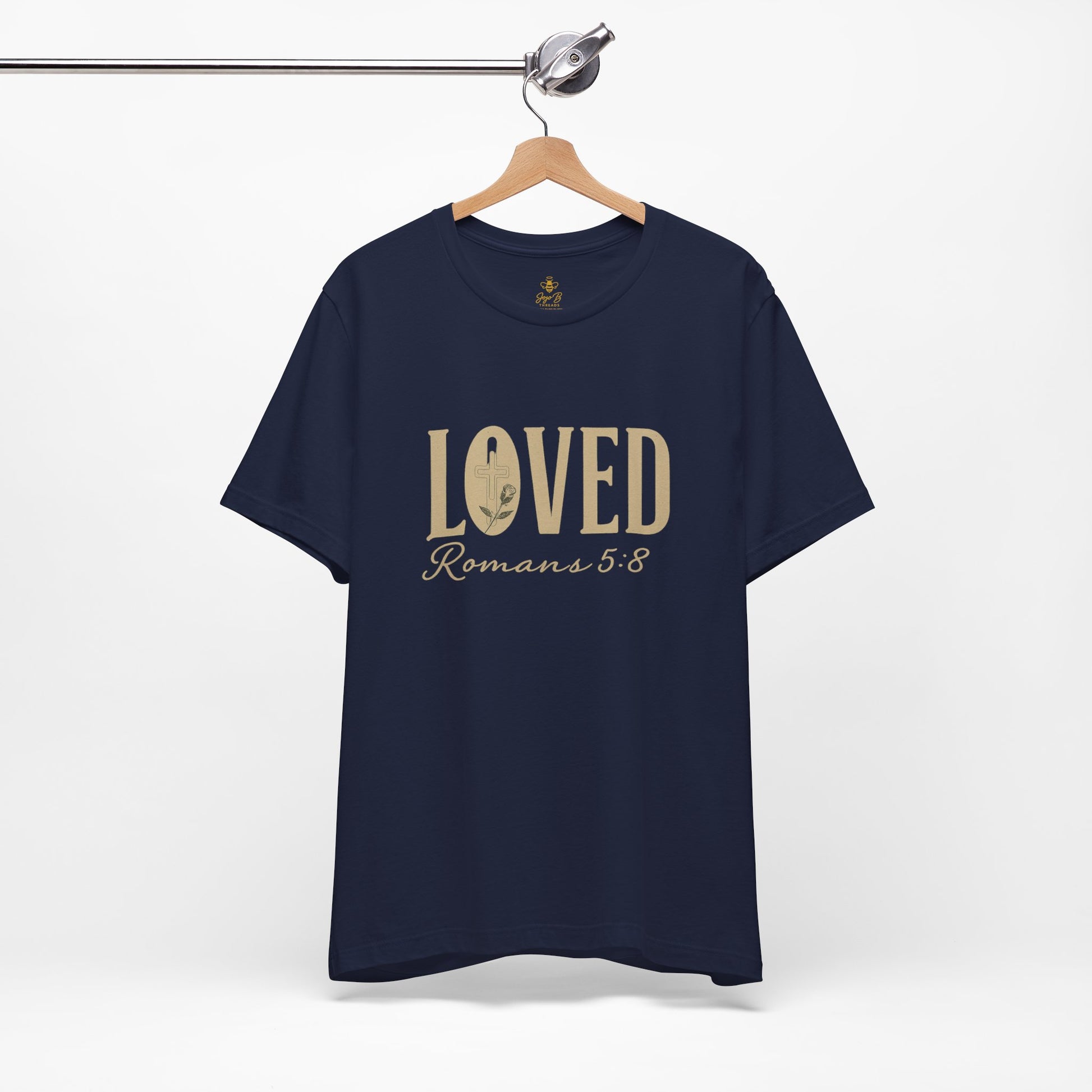 Bold. Simple. Powerful. This shirt features the word “LOVED” with a cross embedded in the “O,” and the verse Romans 5:8 beneath it: