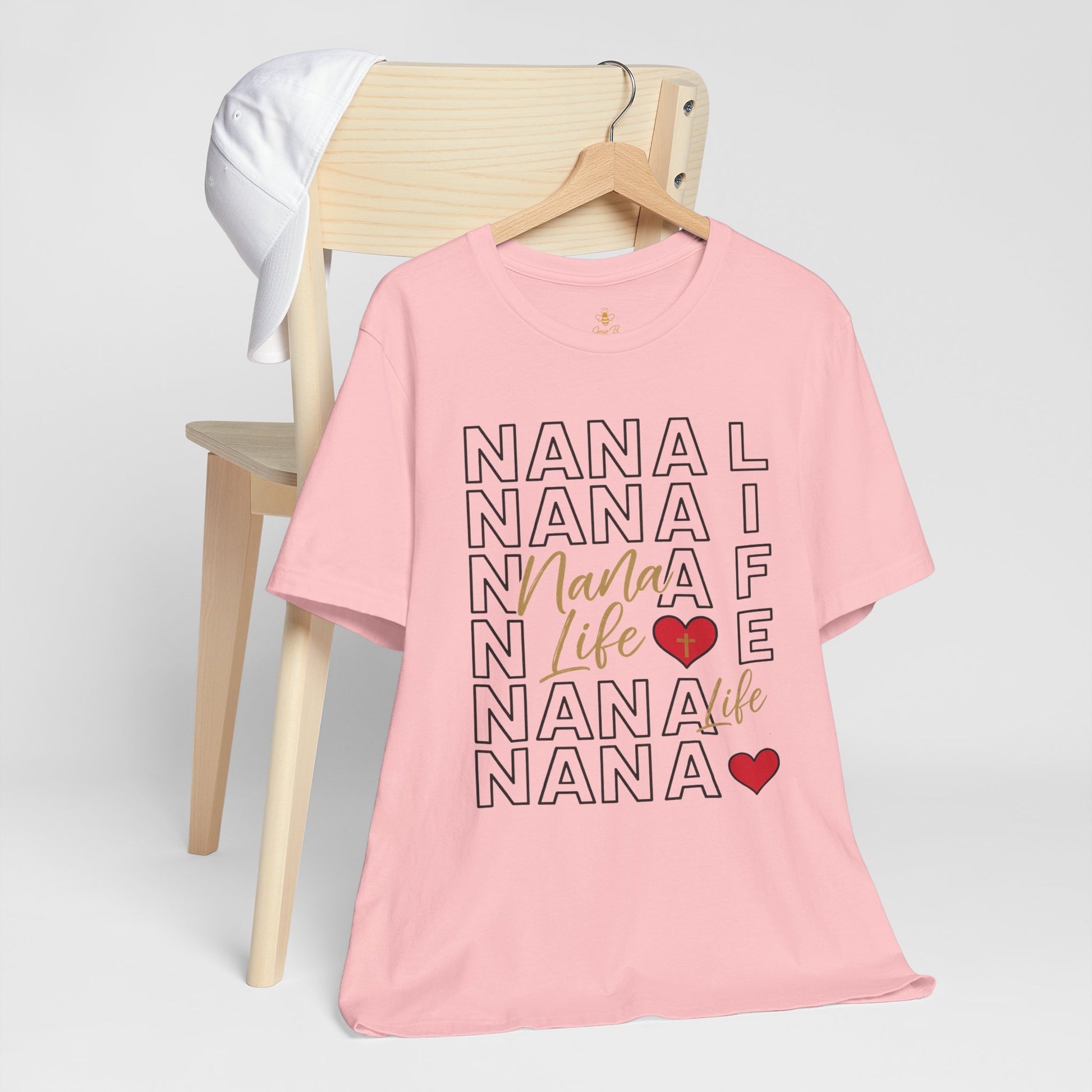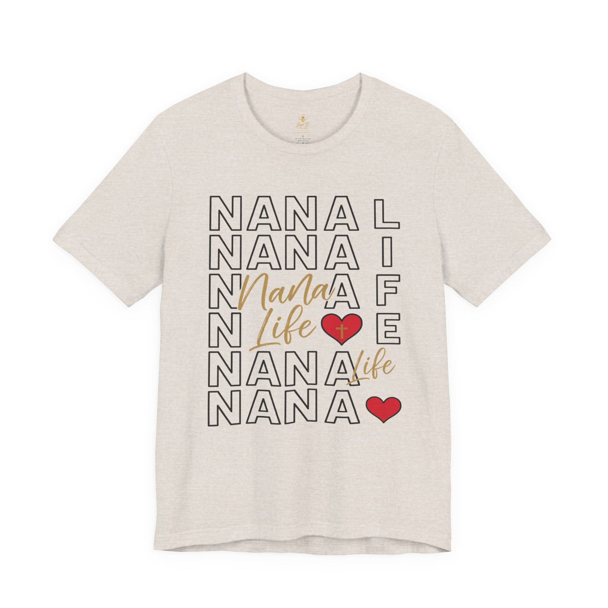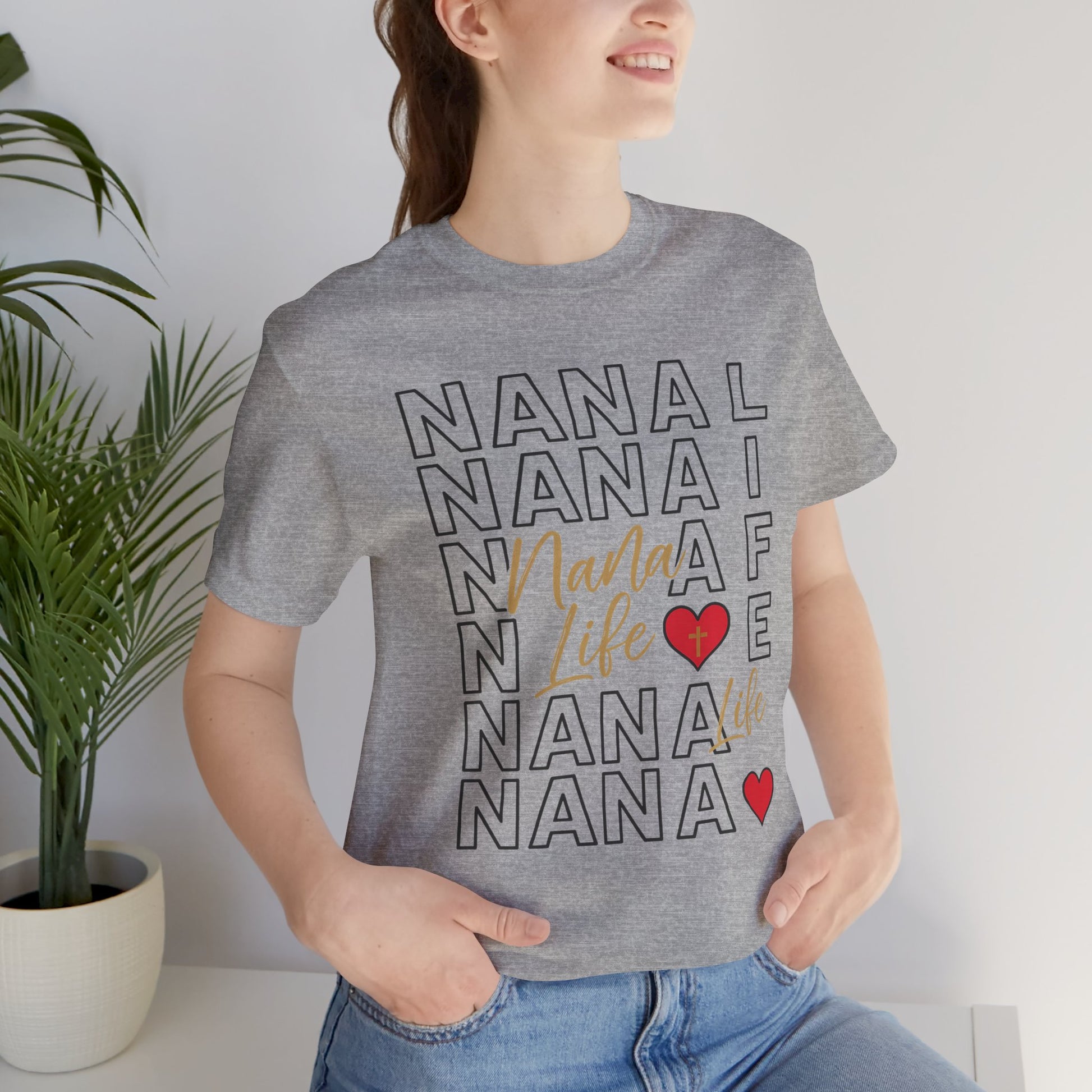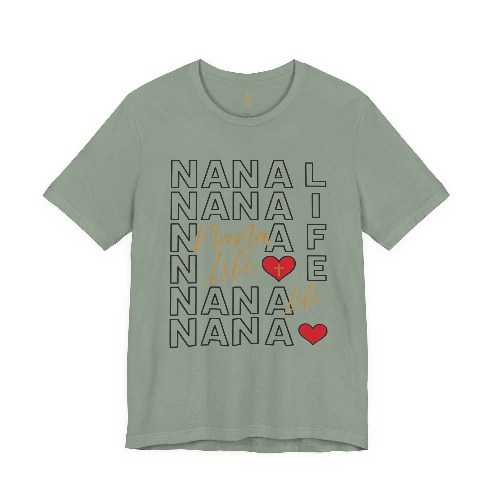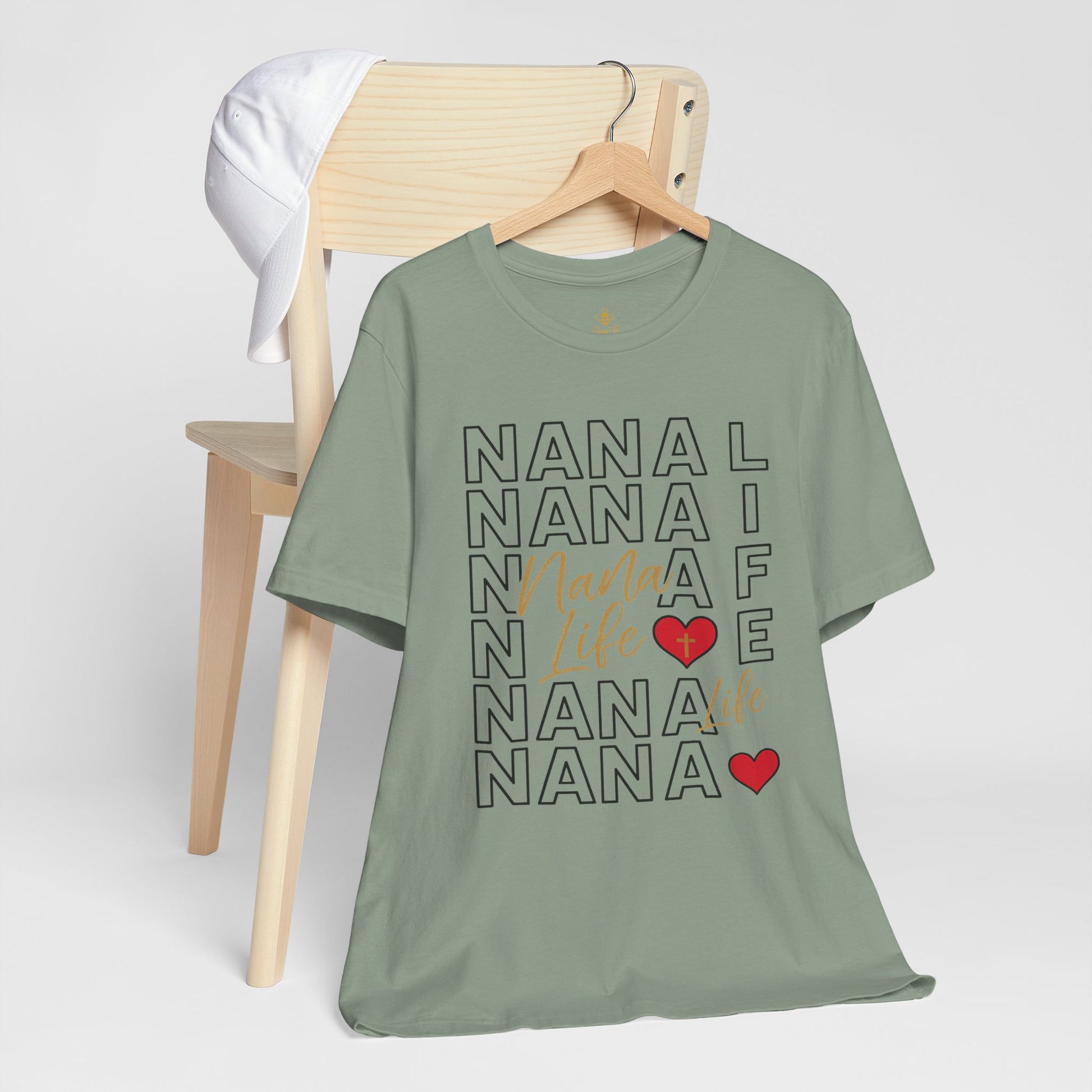 This bold and inspiring tee celebrates the joy of being a nana with a layered repeat-text design, gold script, and a red heart featuring a golden cross. It's a beautiful way to show off your faith and your family pride—all in one stylish package.
