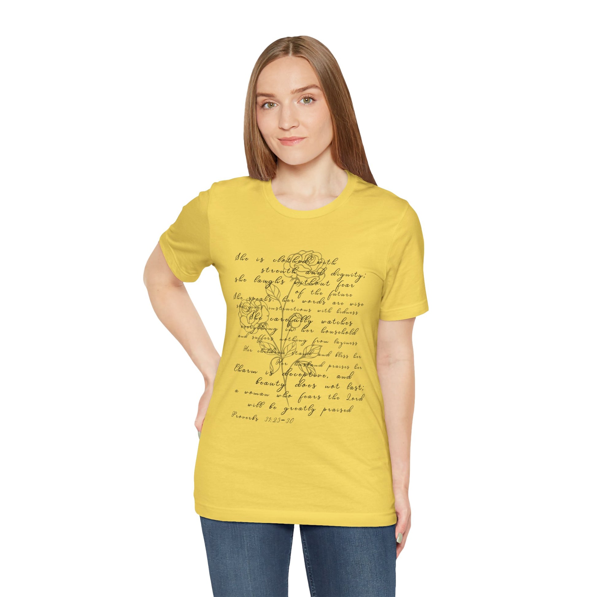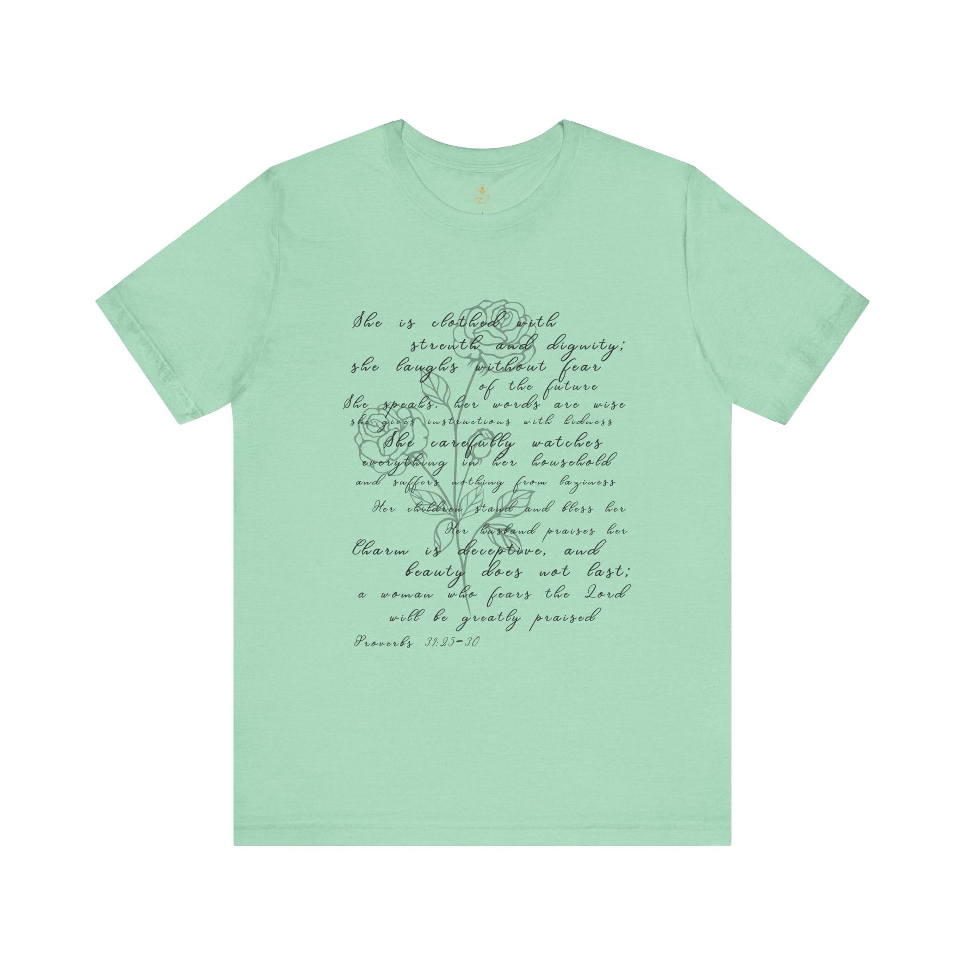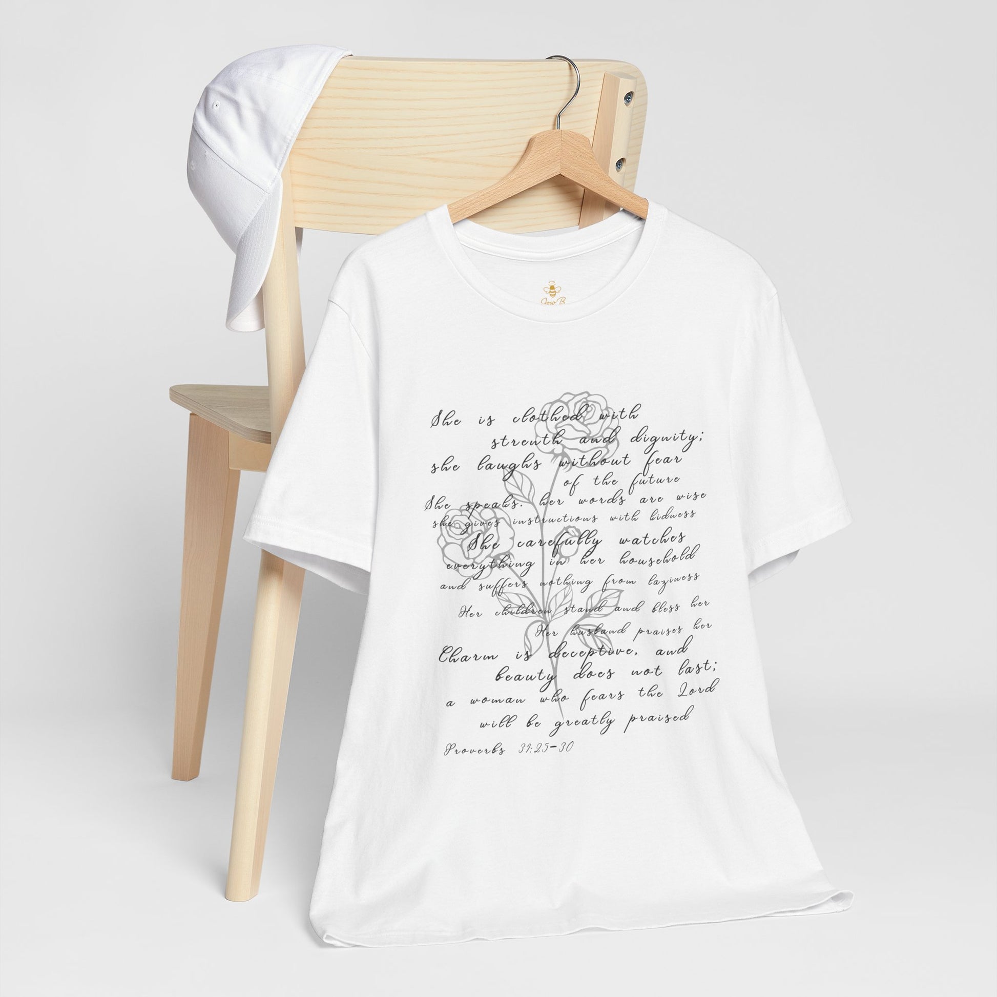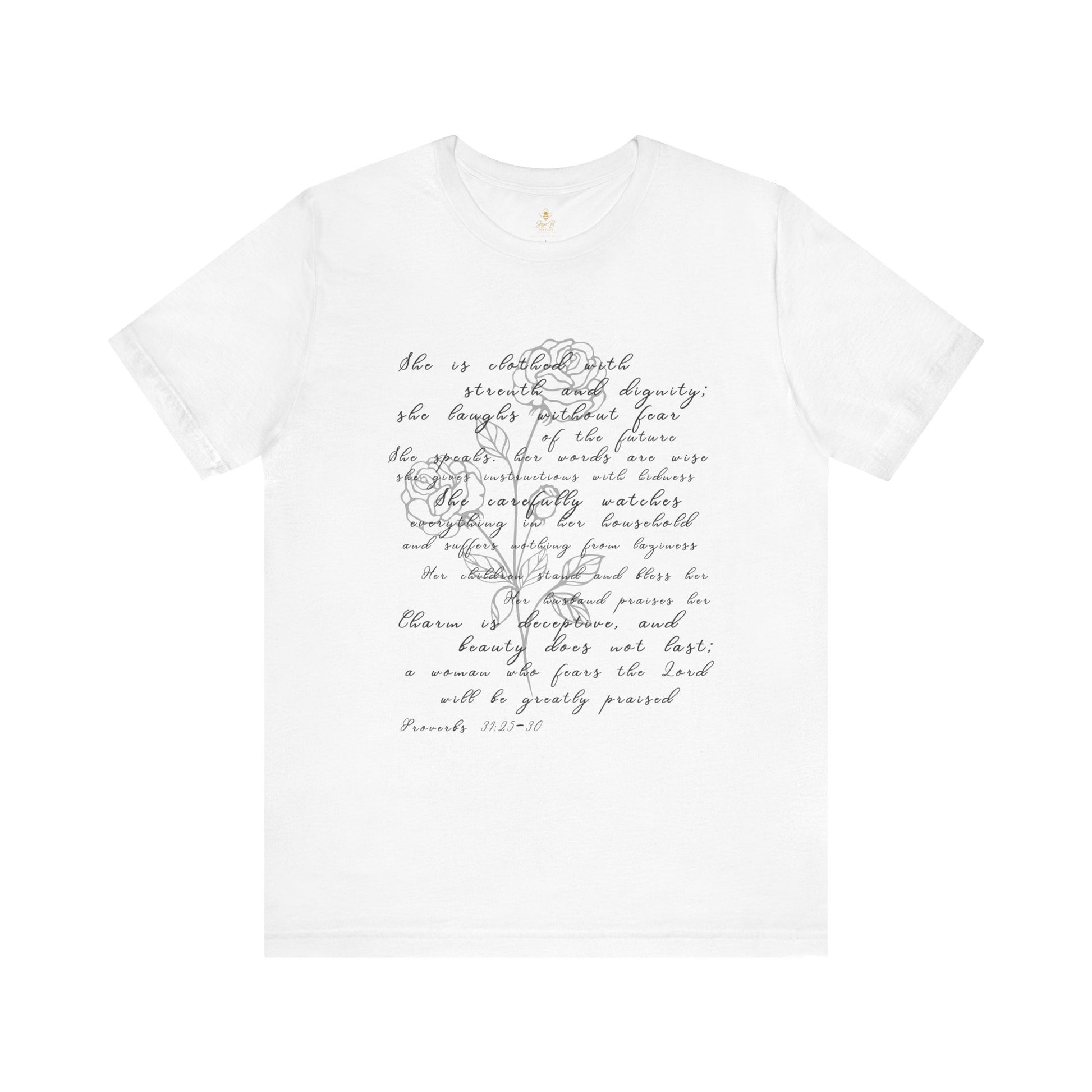 Celebrate the beauty, strength, and dignity of a woman who walks in faith with this inspiring Proverbs 31 t-shirt. Featuring elegant handwritten-style typography and a modern aesthetic, this design highlights the powerful qualities of a virtuous woman as described in Scripture. Perfect for Bible studies, church gatherings, women’s ministry events, or as a meaningful gift for a loved one.