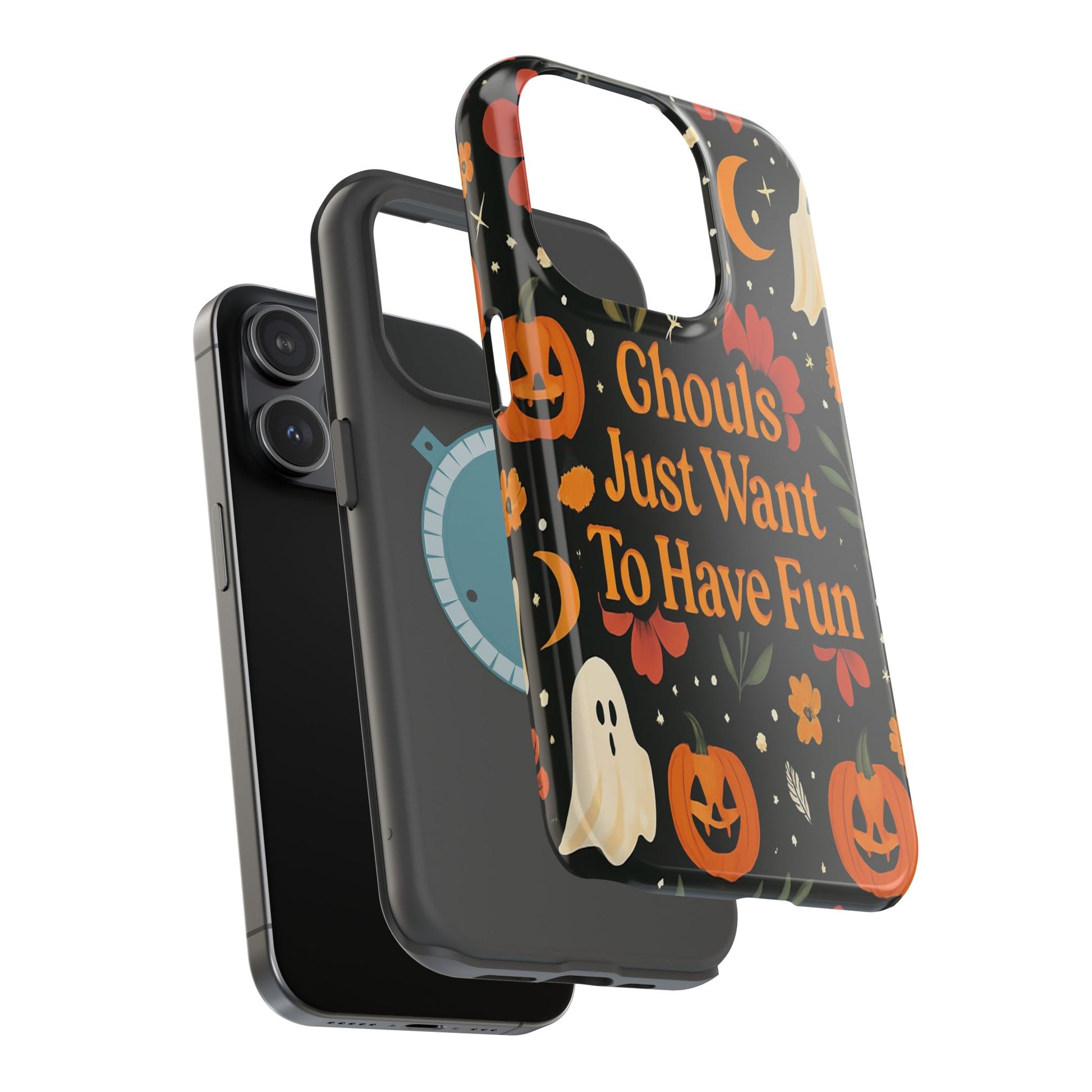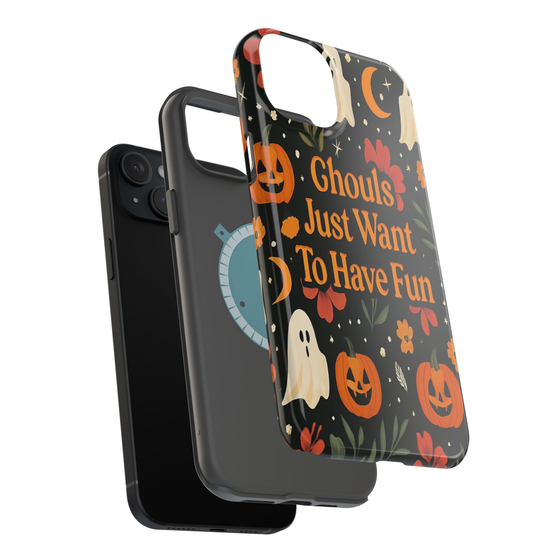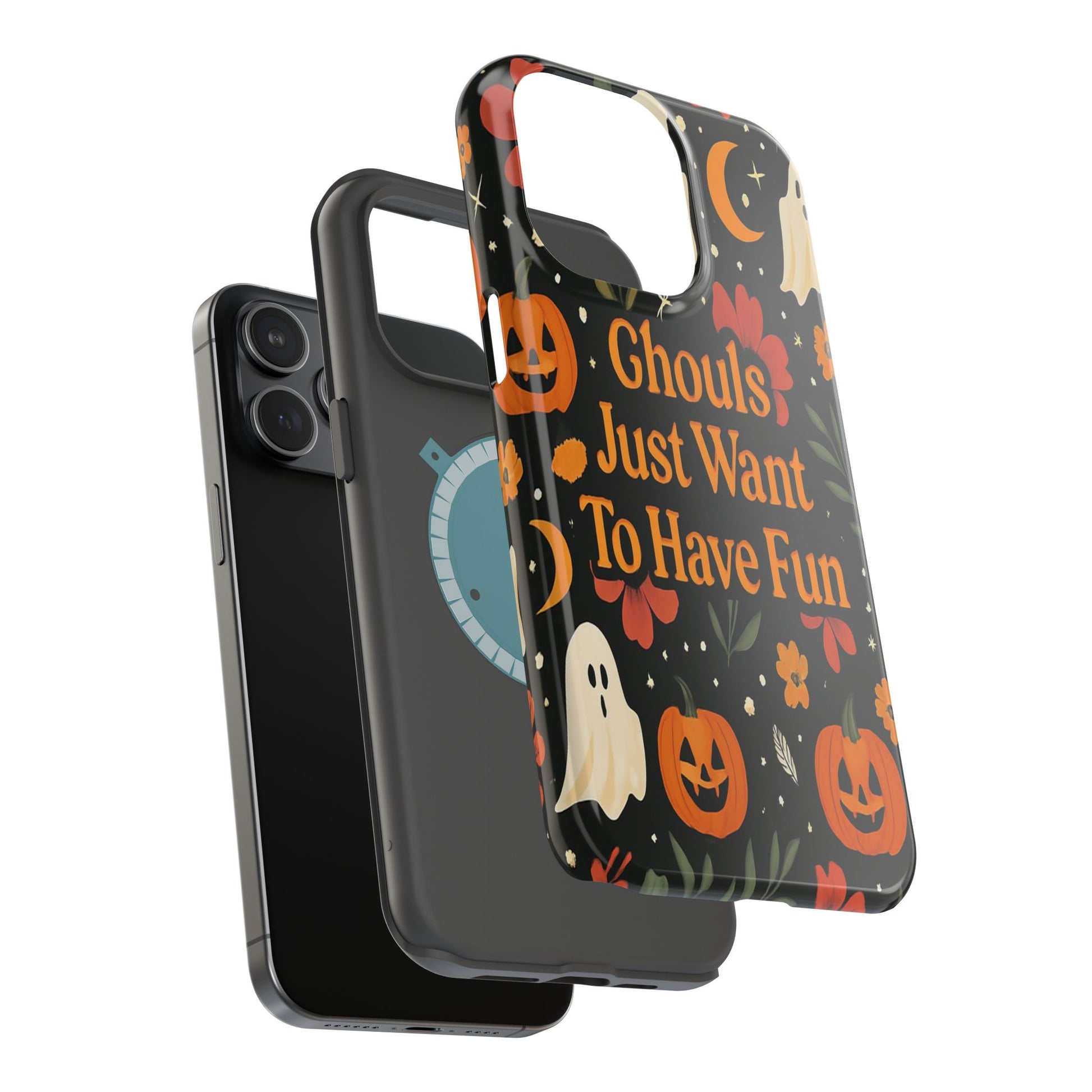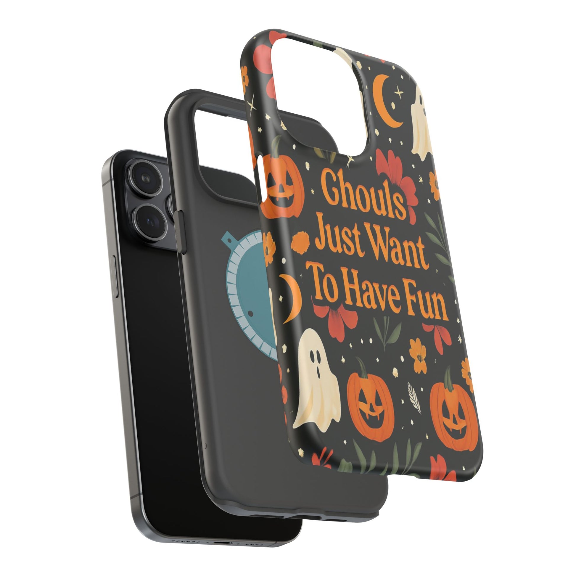 Our Ghouls Just Want To Have Fun iPhone Case brings Halloween flair to your everyday style. Featuring playful ghosts, cheerful pumpkins, and fall florals on a moody black backdrop, this design screams (in the cutest way) fall vibes and ghoul power.