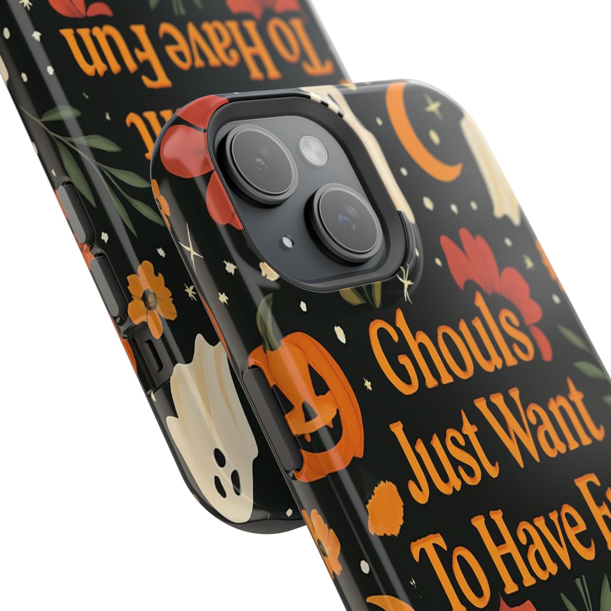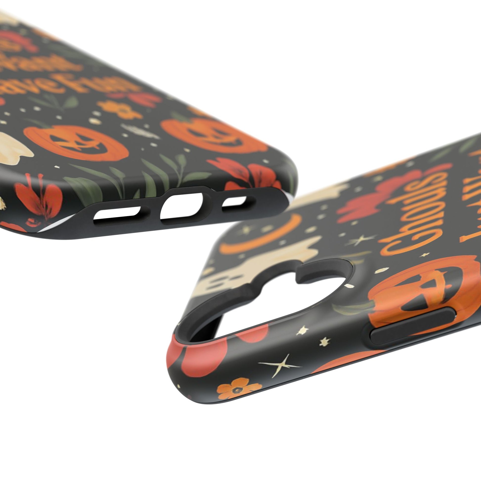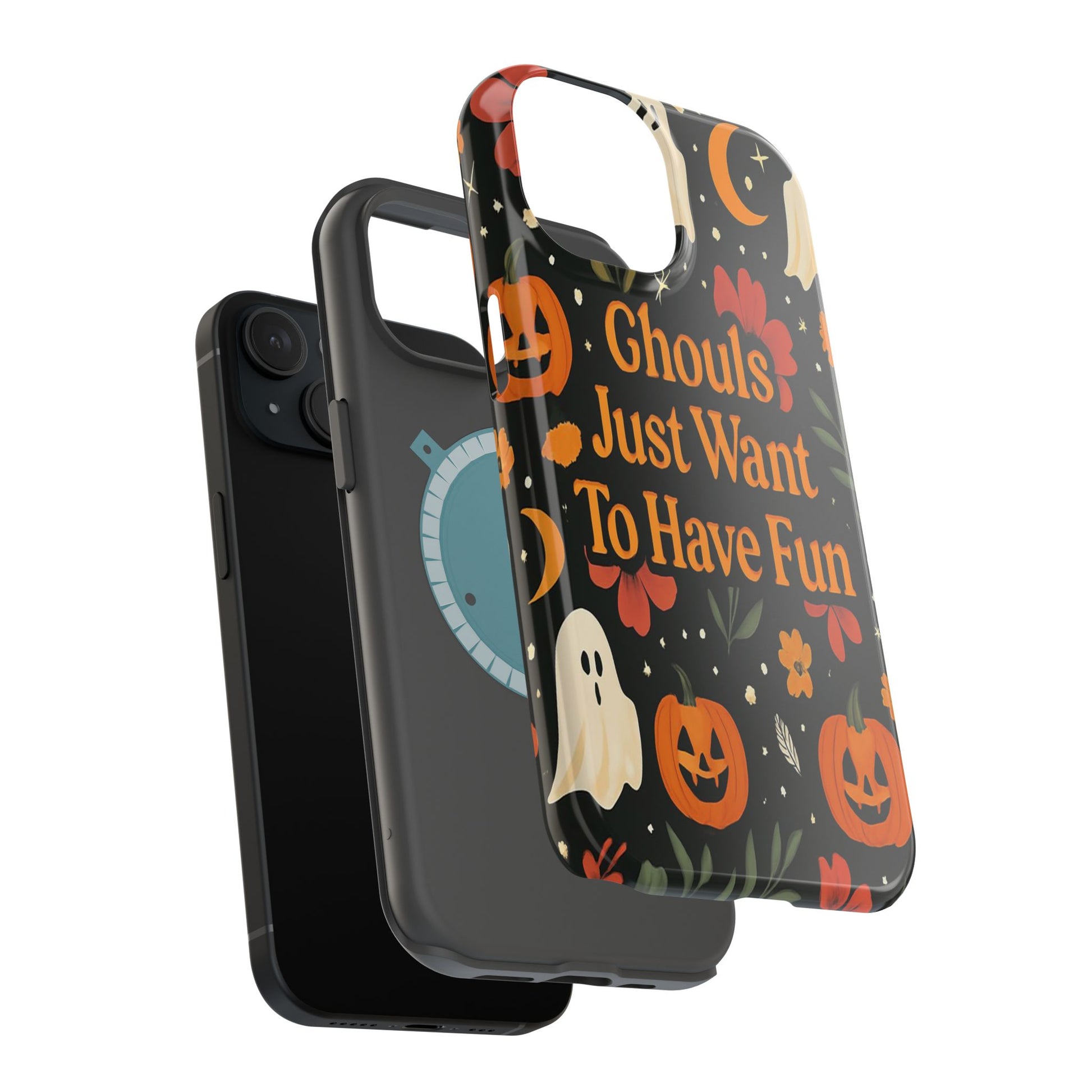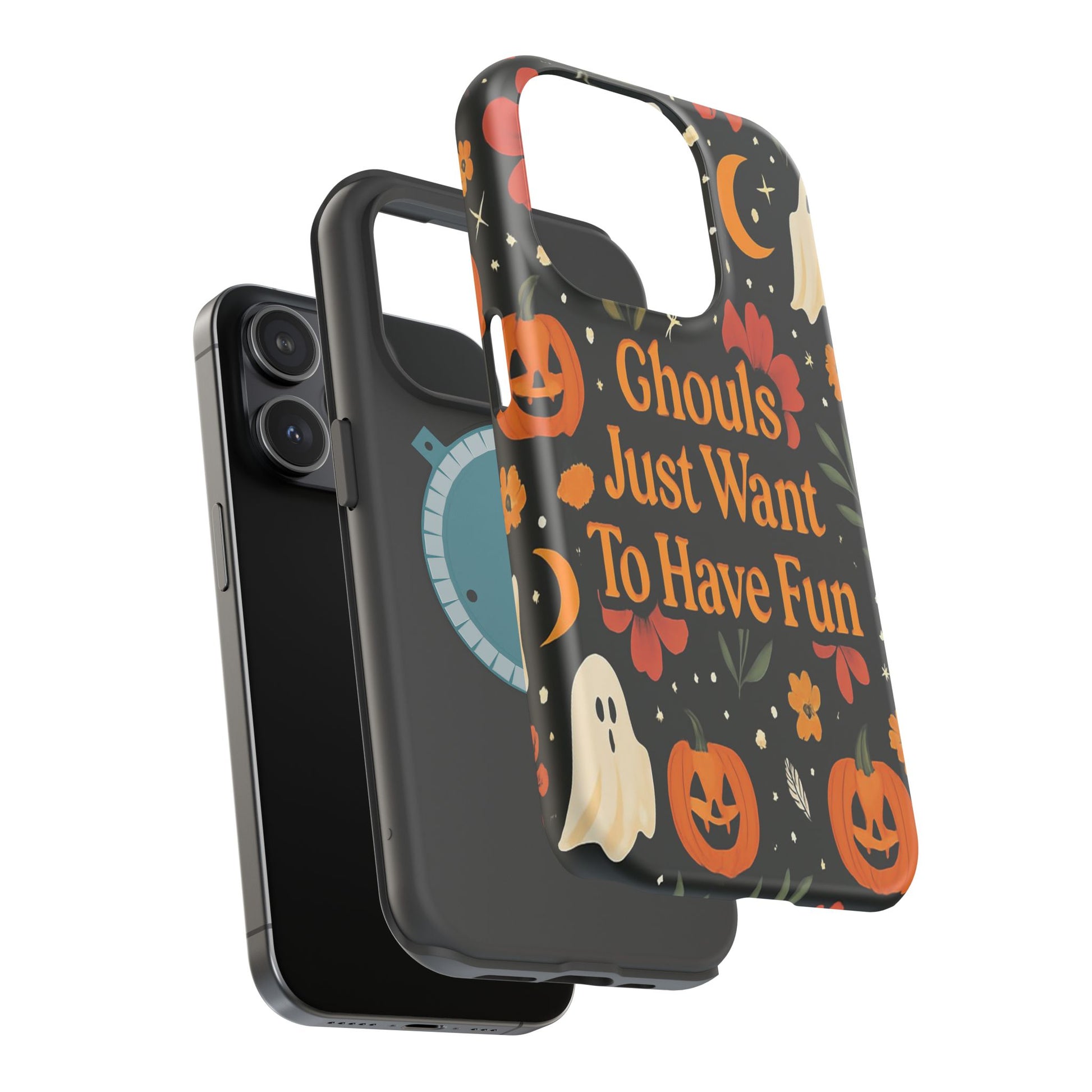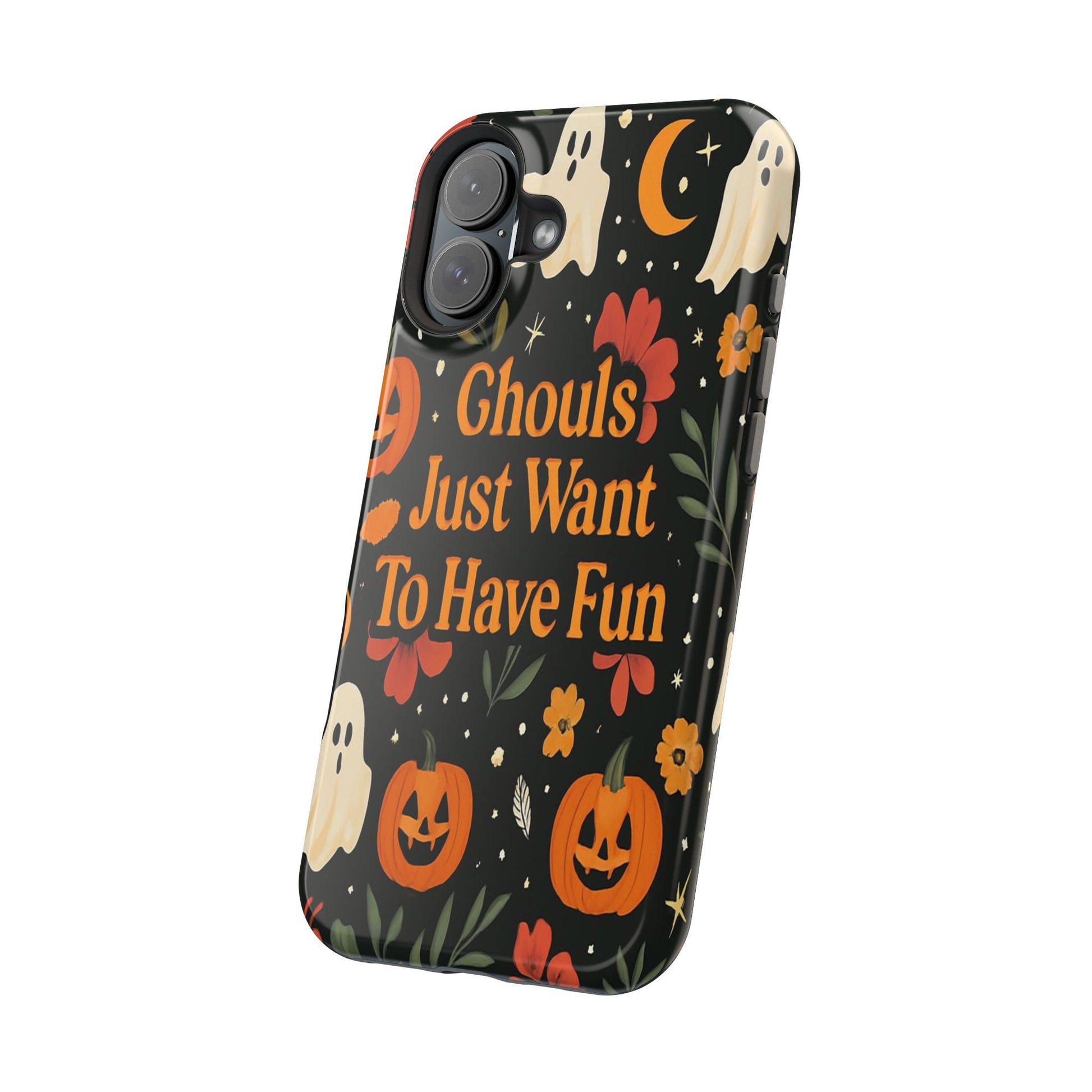 Our Ghouls Just Want To Have Fun iPhone Case brings Halloween flair to your everyday style. Featuring playful ghosts, cheerful pumpkins, and fall florals on a moody black backdrop, this design screams (in the cutest way) fall vibes and ghoul power.