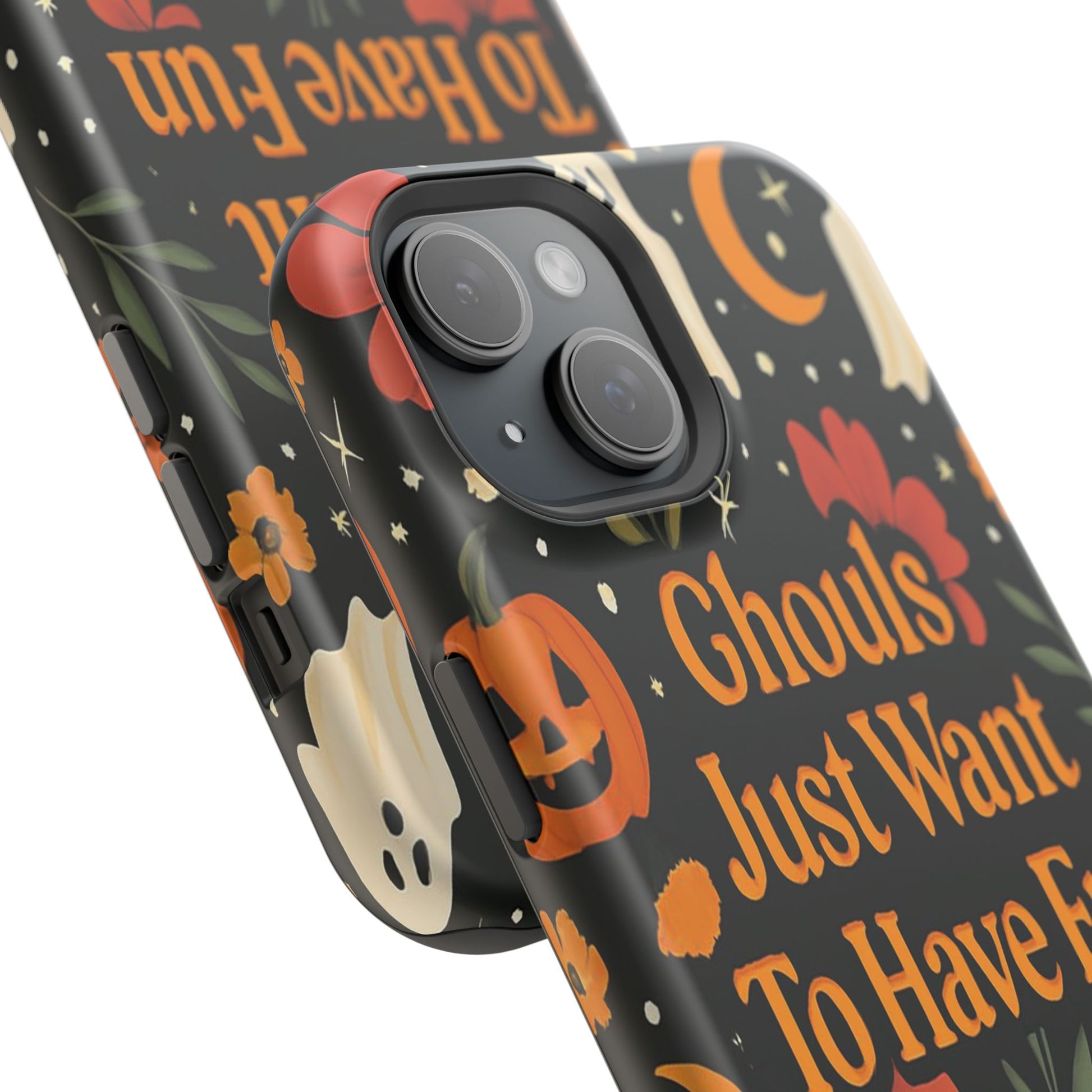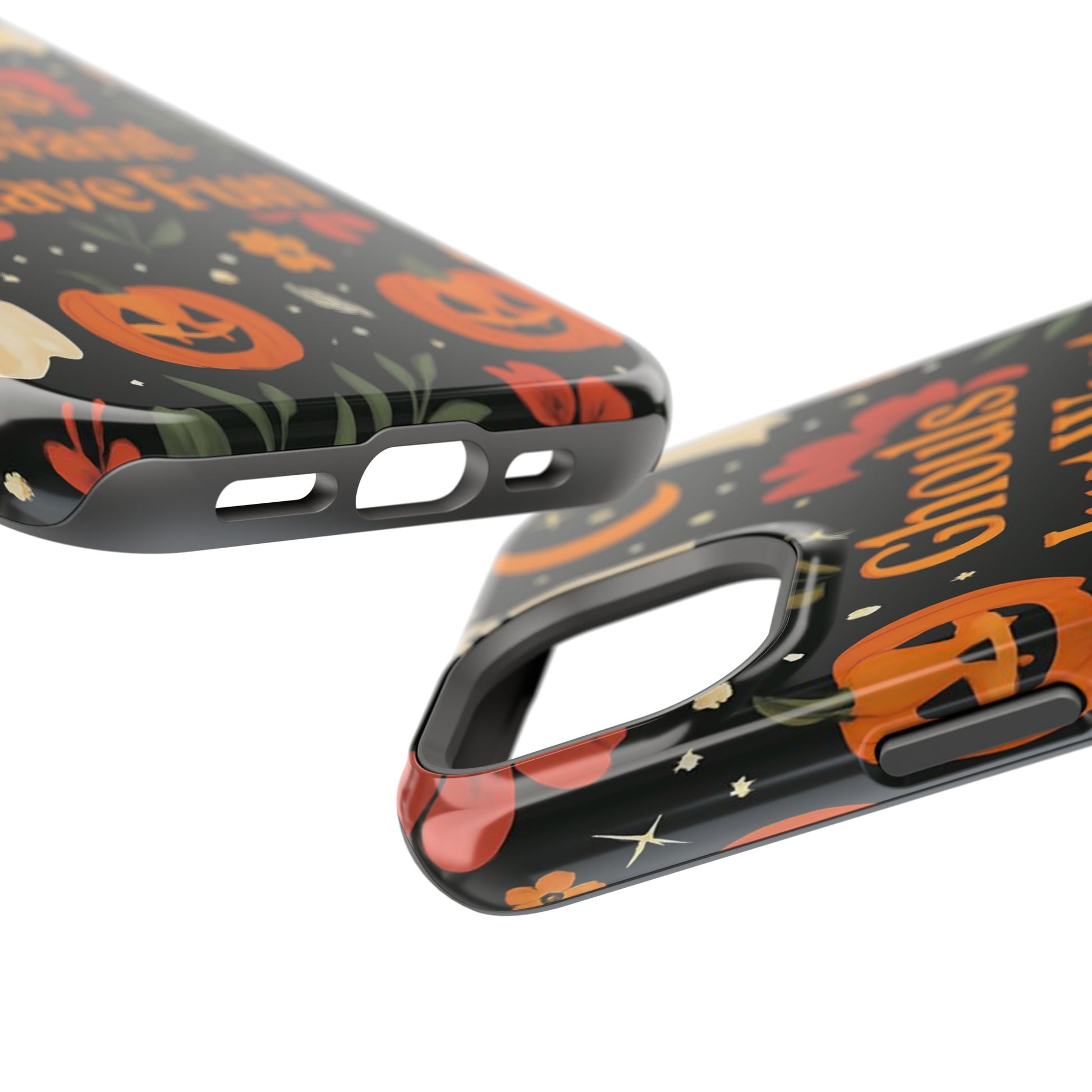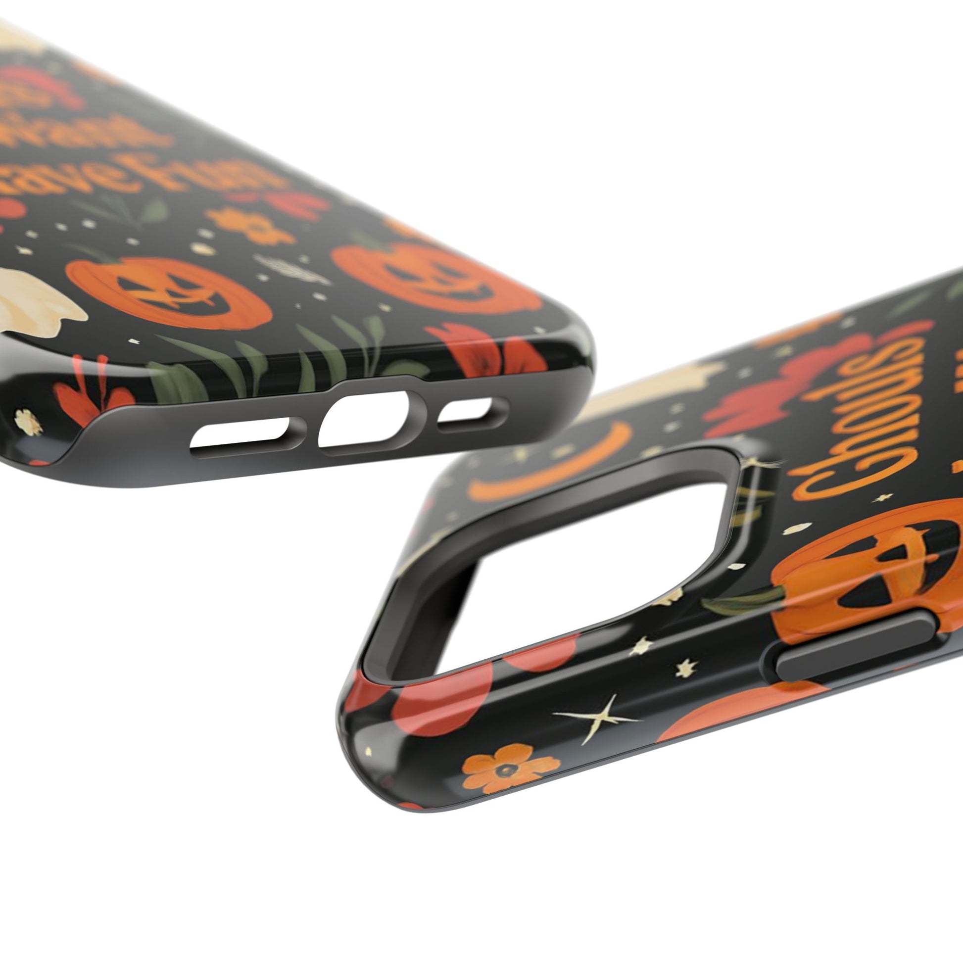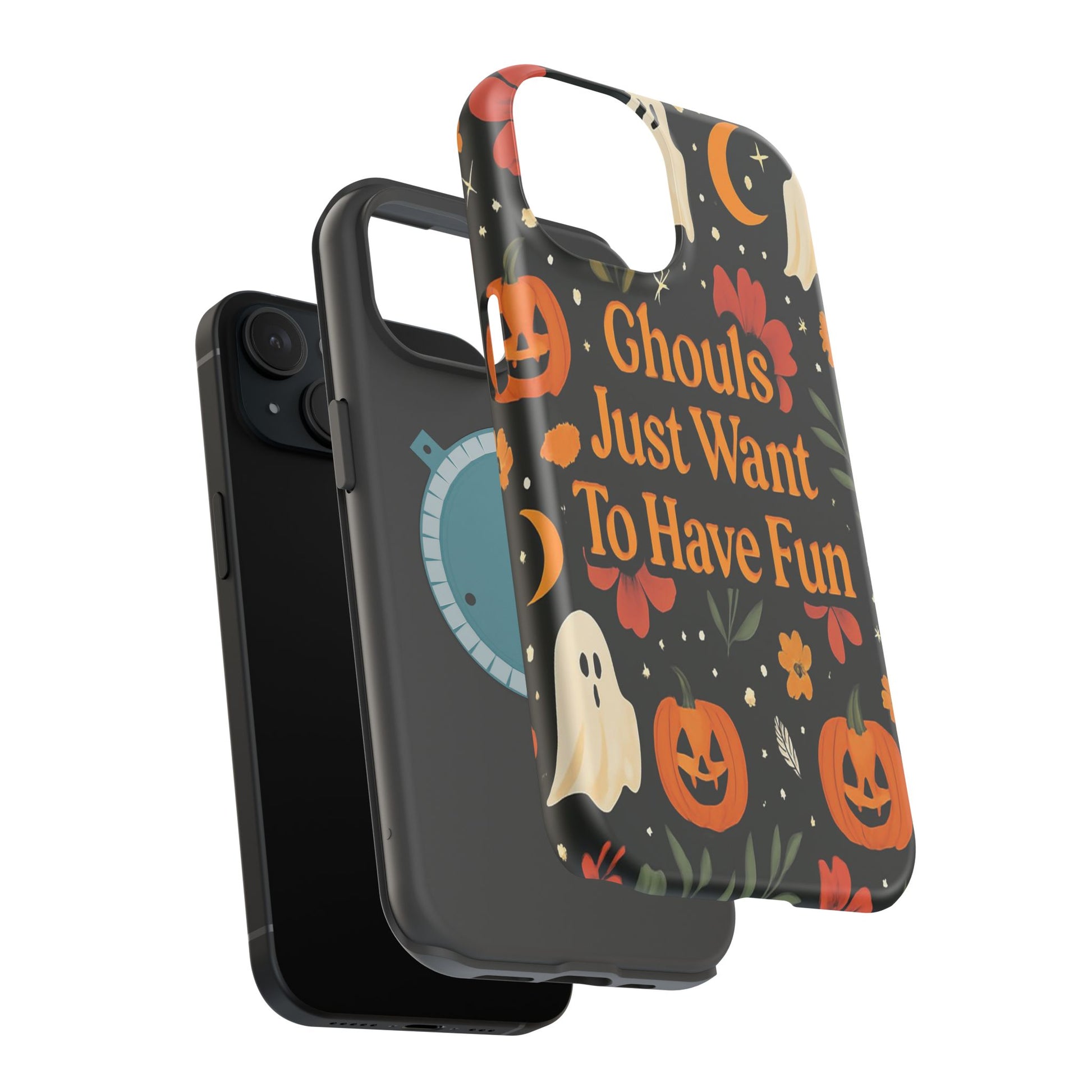 Our Ghouls Just Want To Have Fun iPhone Case brings Halloween flair to your everyday style. Featuring playful ghosts, cheerful pumpkins, and fall florals on a moody black backdrop, this design screams (in the cutest way) fall vibes and ghoul power.